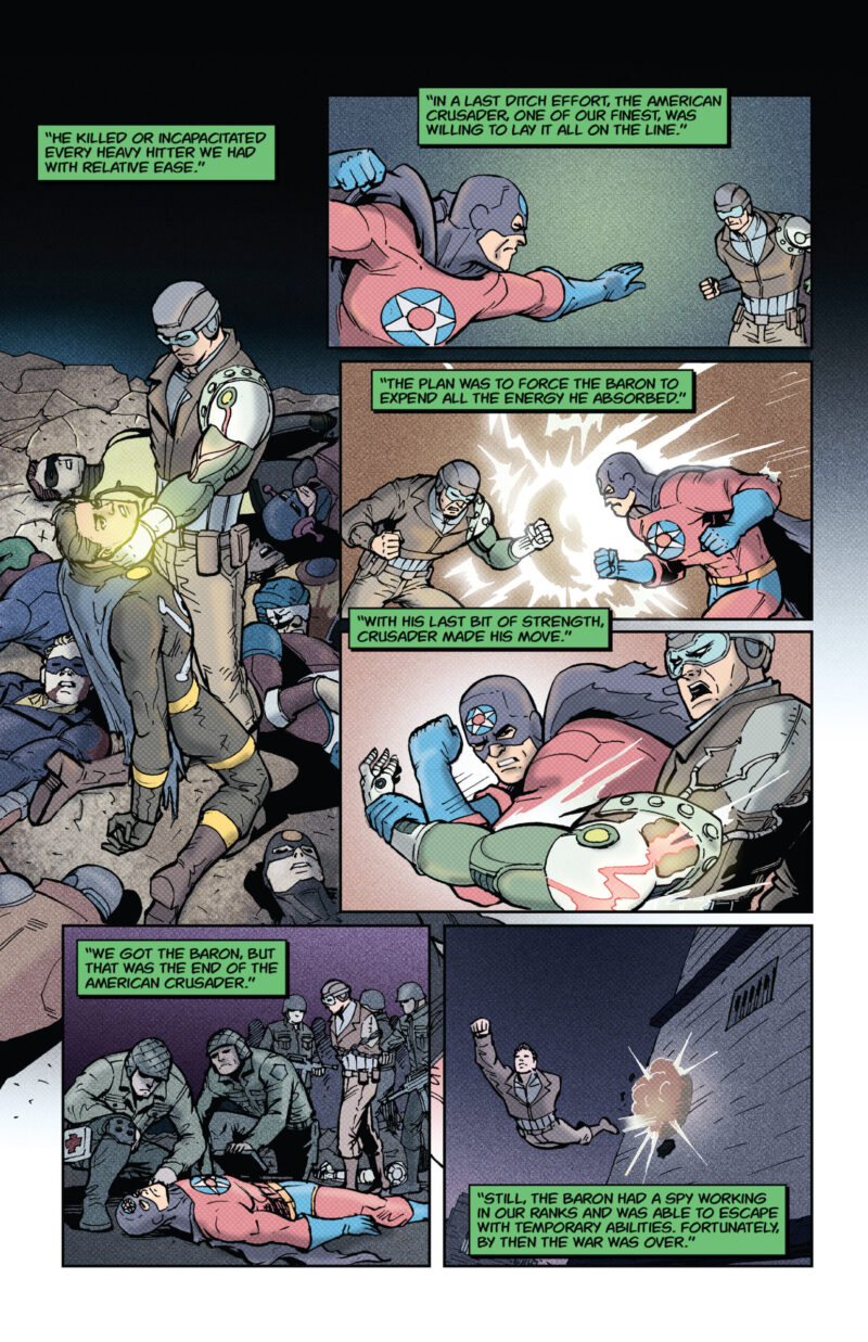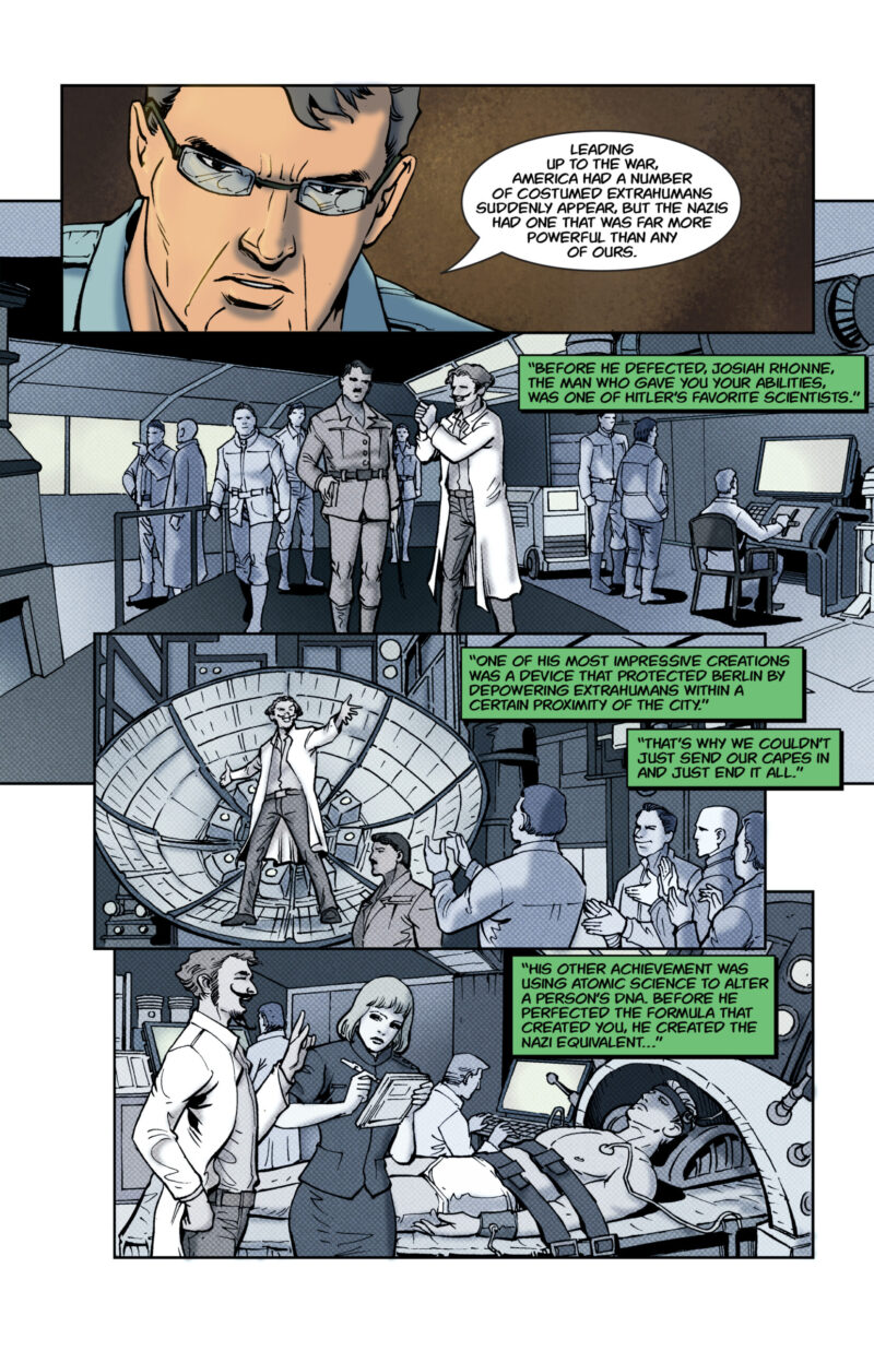 The secret of The Baron revealed! After the gruesome discovery in the third chapter of The Atomic Thunderbolt, our hero demands that McPherson comes clean. With the secrets laid out on the table, McPherson recounts the history of The Baron and what happened to the superheroes of World War II.